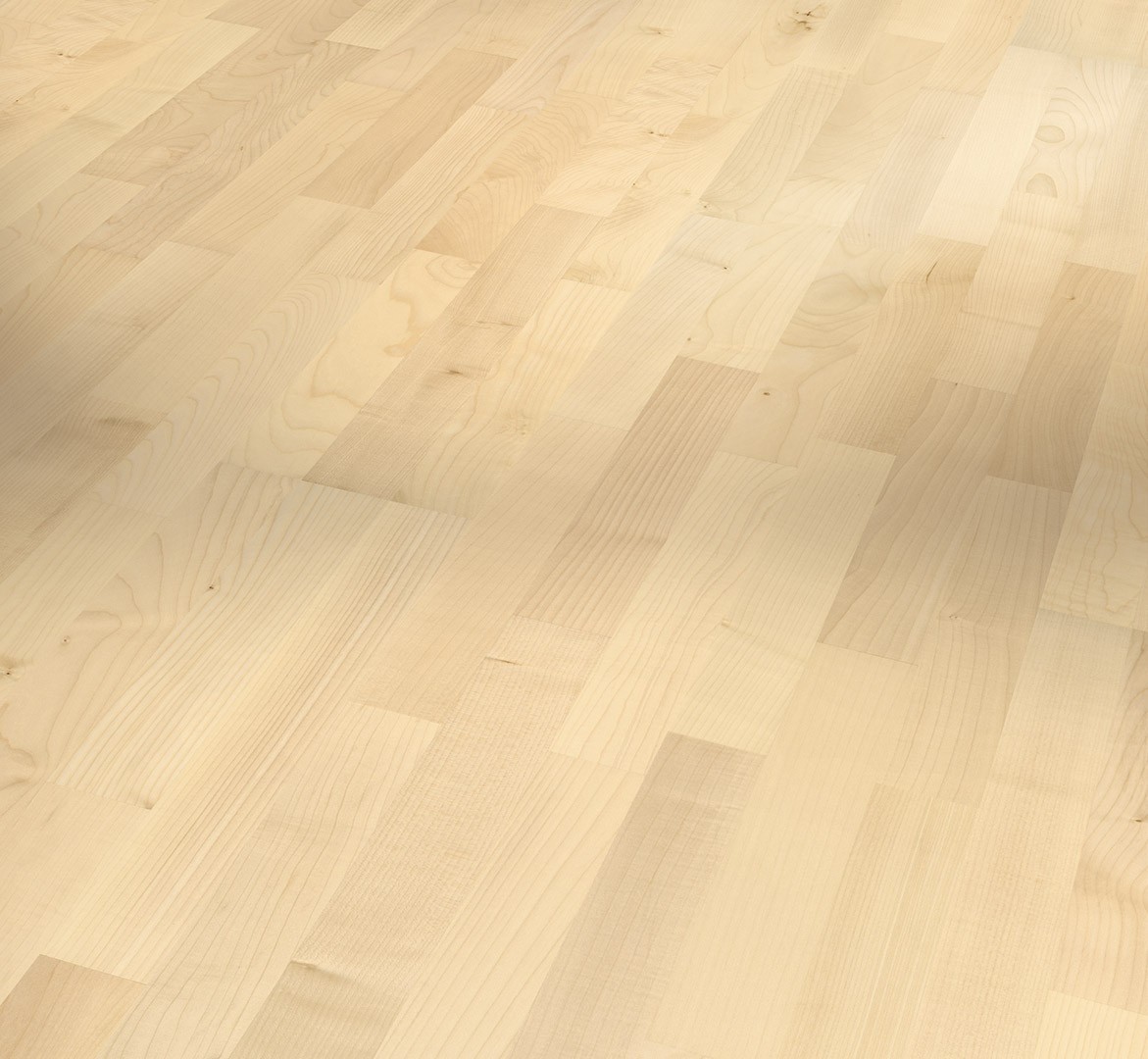 Parador engineered wood flooring European maple 3-strip from the Classic 3060 product line meets the highest demands in terms of design and quality and can satisfy a wide range of design requirements. The high-quality engineered wood flooring has a matt lacquer finish and creates a very special and natural atmosphere for any living room ambience. The planks of uncompromising quality are available as a 3-strip in the format 2200 x 185 x 13 mm. The Natur assortment is the best basis for a flooring design with a natural but balanced overall effect. The design of the planks has no bevels, so that the planks join together without any noticeable gaps, creating a uniform and harmonious installation pattern. Durable and stylish in installation, Parador Classic 3060 engineered wood flooring is easy to install thanks to an Automatic-Click system with long and end edge locking. The all-round impregnation of the lamellas and top layers ensures reliable swelling protection. The top layer is about 3.6 mm high. This engineered wood flooring is suitable for installation on underfloor heating systems. The manufacturer’s guarantee is 25 years. For the production of Parador engineered wood flooring from the Classic 3060 product line, wood from sustainably managed sources is predominantly used. Parador engineered wood flooring has received several certifications.