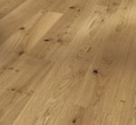 Parador engineered wood flooring Oak wide plank from the Classic 3060 product line meets the highest demands in terms of design and quality and can satisfy a wide range of design requirements. The high-quality engineered wood flooring has a matt lacquer finish and creates a very special and natural atmosphere for any living room ambience. The planks of uncompromising quality are available as a wide plank in the format 2200 x 185 x 13 mm. The knotty look, the pronounced play of colours and the distinct grain make the Rustikal assortment look particularly original. The brushed texture creates a particularly authentic feel. Due to the processing with stainless steel brushes, the natural grain of the wood is very intensive. The planks have an all-round mini bevel, which discreetly interrupts the appearance of the installed planks and underlines the typical engineered wood flooring look. Durable and stylish in installation, Parador Classic 3060 engineered wood flooring is easy to install thanks to an Automatic-Click system with long and end edge locking. The all-round impregnation of the lamellas and top layers ensures reliable swelling protection. The top layer is about 3.6 mm high. This engineered wood flooring is suitable for installation on underfloor heating systems. The manufacturer’s guarantee is 25 years. For the production of Parador engineered wood flooring from the Classic 3060 product line, wood from sustainably managed sources is predominantly used. Parador engineered wood flooring has received several certifications.