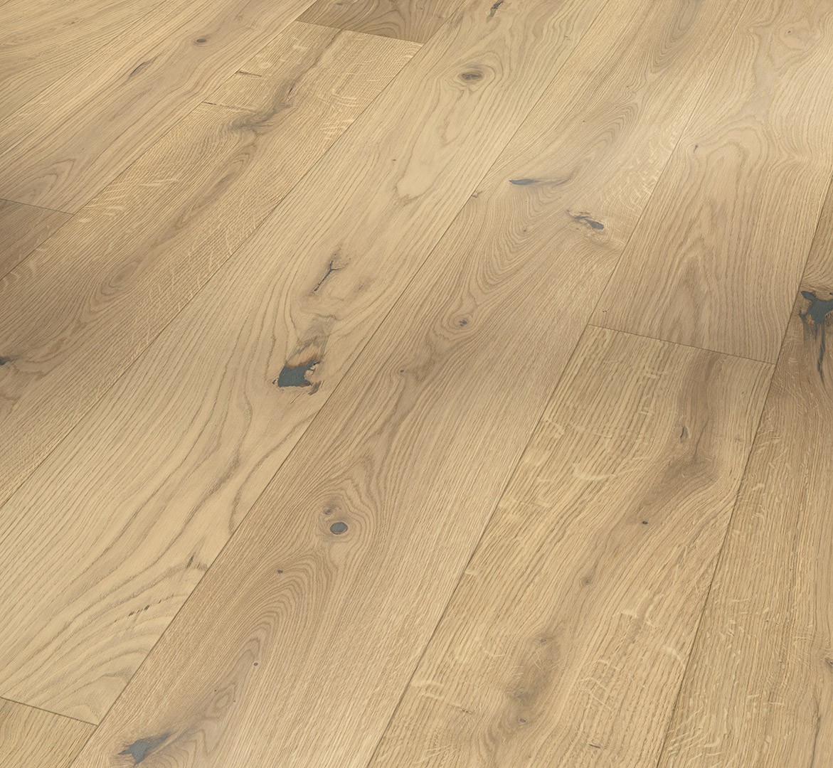 Parador engineered wood flooring Oak Pure wide plank from the Classic 3060 product line meets the highest demands in terms of design and quality and can satisfy a wide range of design requirements. The high-quality engineered wood flooring has a natural oil plus finish and creates a very special and natural atmosphere for any living room ambience. The planks of uncompromising quality are available as a wide plank in the format 2200 x 185 x 13 mm. The knotty look, the pronounced play of colours and the distinct grain make the Rustikal assortment look particularly original. The planks have an all-round mini bevel, which discreetly interrupts the appearance of the installed planks and underlines the typical engineered wood flooring look. Durable and stylish in installation, Parador Classic 3060 engineered wood flooring is easy to install thanks to an Automatic-Click system with long and end edge locking. The all-round impregnation of the lamellas and top layers ensures reliable swelling protection. The top layer is about 3.6 mm high. This engineered wood flooring is suitable for installation on underfloor heating systems. The manufacturer’s guarantee is 25 years. For the production of Parador engineered wood flooring from the Classic 3060 product line, wood from sustainably managed sources is predominantly used. Parador engineered wood flooring has received several certifications.