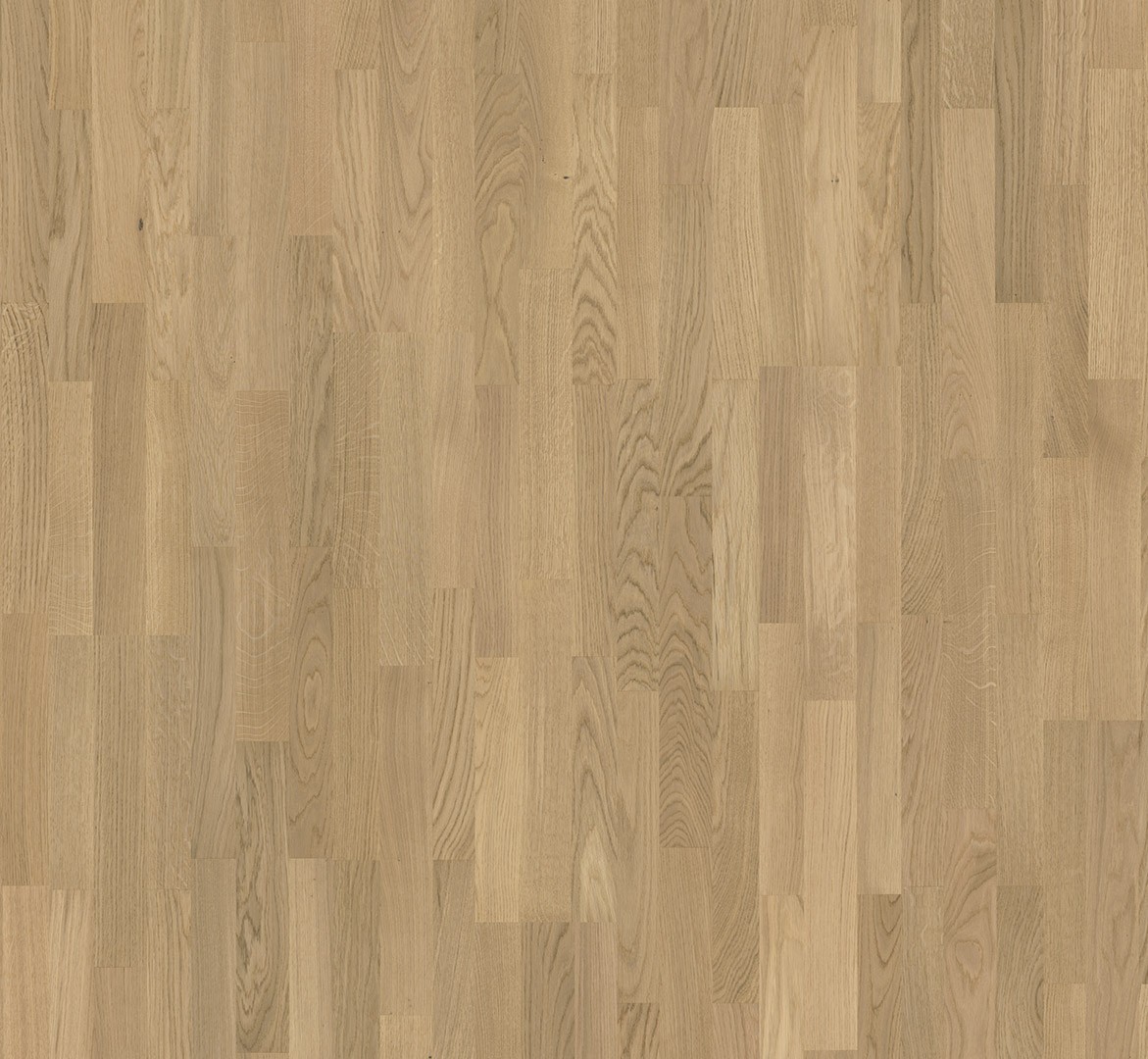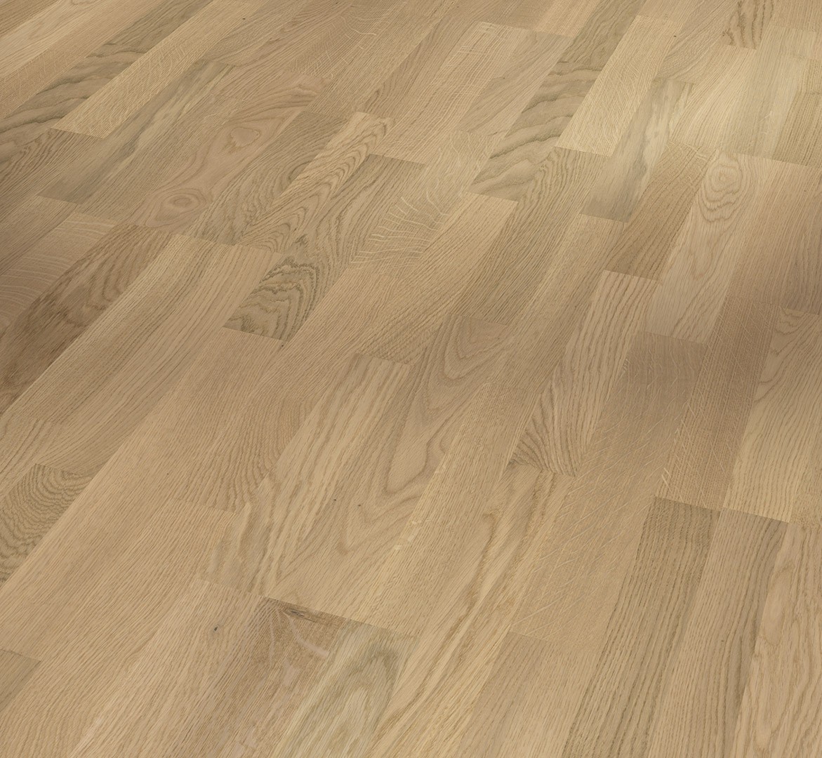 Parador engineered wood flooring Oak Sauvignon light-whitewashed 3-strip from the Classic 3060 product line meets the highest demands in terms of design and quality and can satisfy a wide range of design requirements. The high-quality engineered wood flooring has a white matt lacquer finish and creates a very special and natural atmosphere for any living room ambience. The planks of uncompromising quality are available as a 3-strip in the format 2200 x 185 x 13 mm. The Natur assortment is the best basis for achieving a natural and original overall effect. The design of the planks has no bevels, so that the planks join together without any noticeable gaps, creating a uniform and harmonious installation pattern. Durable and stylish in installation, Parador Classic 3060 engineered wood flooring is easy to install thanks to an Automatic-Click system with long and end edge locking. The all-round impregnation of the lamellas and top layers ensures reliable swelling protection. The top layer is about 3.6 mm high. This engineered wood flooring is suitable for installation on underfloor heating systems. The manufacturer’s guarantee is 25 years. For the production of Parador engineered wood flooring from the Classic 3060 product line, wood from sustainably managed sources is predominantly used. Parador engineered wood flooring has received several certifications.