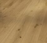 Parador engineered wood flooring Oak Soave natural wide plank from the Classic 3060 product line meets the highest demands in terms of design and quality and can satisfy a wide range of design requirements. The high-quality engineered wood flooring has a matt lacquer finish and creates a very special and natural atmosphere for any living room ambience. The planks of uncompromising quality are available as a wide plank in the format 2200 x 185 x 13 mm. The Living Plus assortment is characterised by a vibrant look and attributes of earthy wood without sapwood. A 4-sided mini bevel discreetly interrupts the appearance of the installed planks and thus underlines the original character of engineered wood flooring. Durable and stylish in installation, Parador Classic 3060 engineered wood flooring is easy to install thanks to an Automatic-Click system with long and end edge locking. The all-round impregnation of the lamellas and top layers ensures reliable swelling protection. The top layer is about 3.6 mm high. This engineered wood flooring is suitable for installation on underfloor heating systems. The manufacturer’s guarantee is 25 years. For the production of Parador engineered wood flooring from the Classic 3060 product line, wood from sustainably managed sources is predominantly used. Parador engineered wood flooring has received several certifications.
